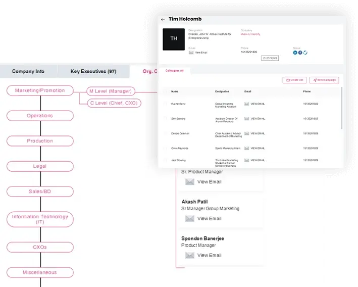 Go beyond company search. Double down on key executives and analyze vital information, such as seniority, title, number of subordinates and more before pulling the final trigger.