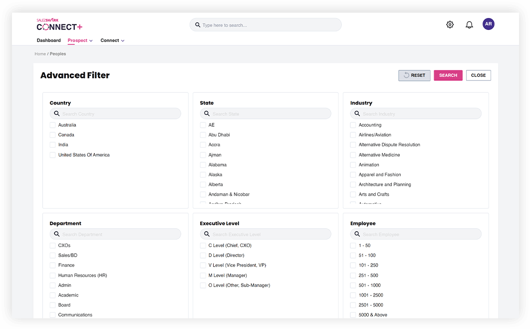 When it comes to swiftly locating data, SalezShark stands out as the premier B2B data provider, aiding businesses with its Connect+ marketing automation suite. A standout feature within Connect+ is the "Smart Search" option. This function provides a smart indexing search, streamlining your quest for specific company or executive information within a B2B sales database. With just a few clicks, prospecting becomes a breeze.